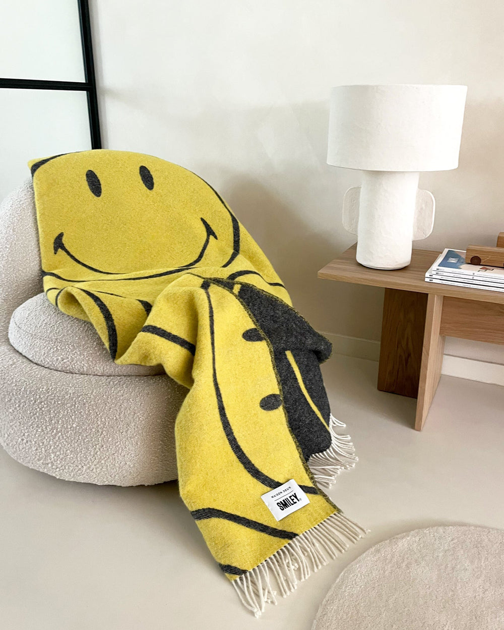We teamed up with world's happiest lifestyle brand Smiley® on an exclusive rug & blanket collection. The iconic Smiley®, that celebrates its 50th anniversary this year, is translated into a super-fun series of rugs and blankets. A true designer piece that boosts up your room with positivity and happiness.