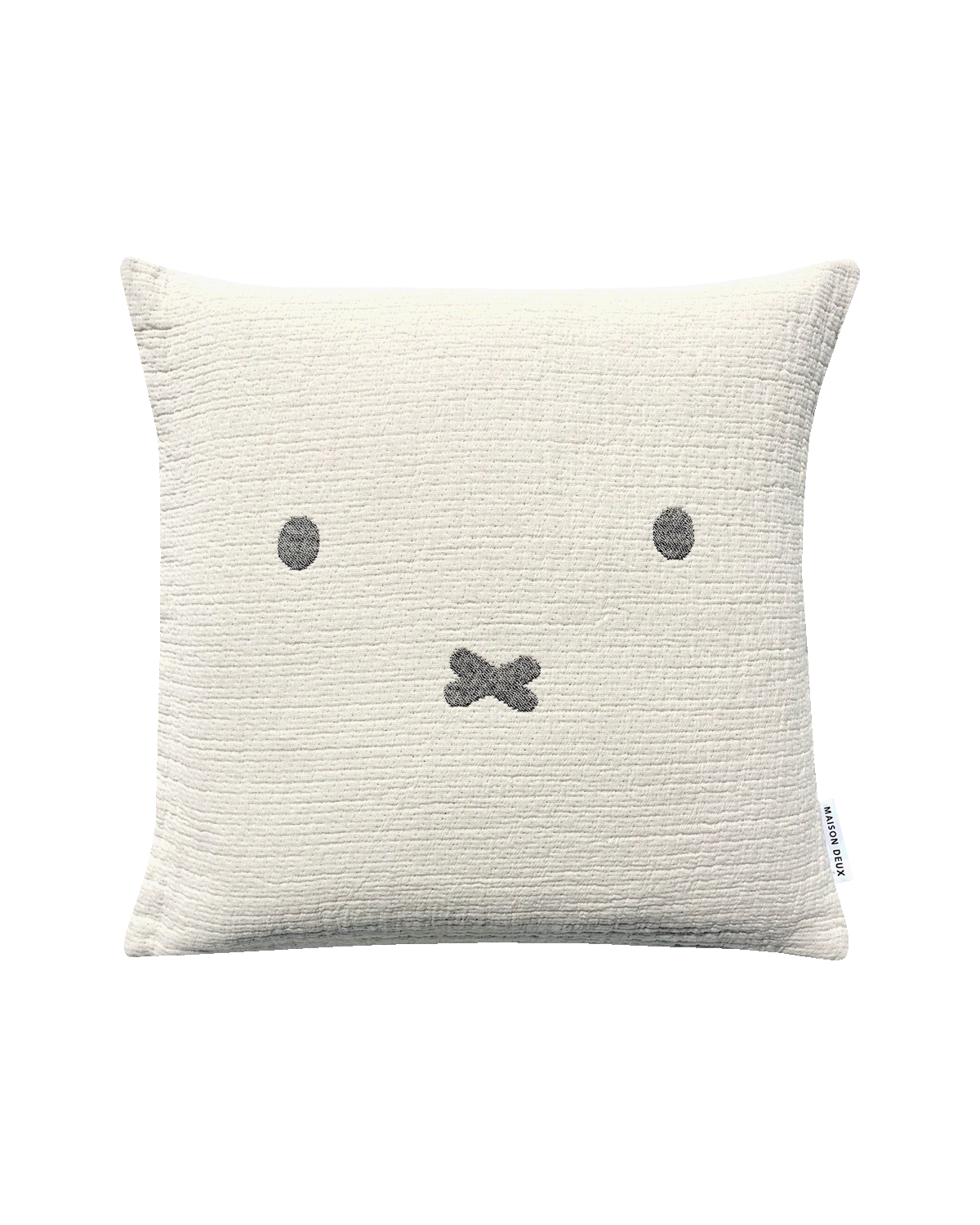 Le coussin en coton Miffy est tissé en jacquard à partir de 100 % coton. Ce coussin léger met en avant les oreilles de Miffy sur le devant et ses yeux au dos. Tissé au Portugal et certifié OEKO-TEX.
